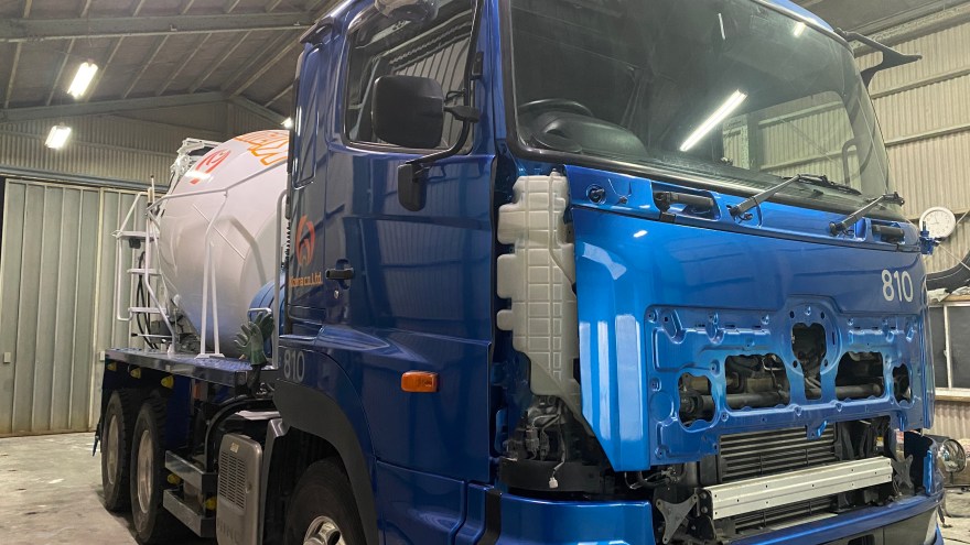 作業完了と思っていたらフロントのメッキーパーツが取り外されていたミキサー車