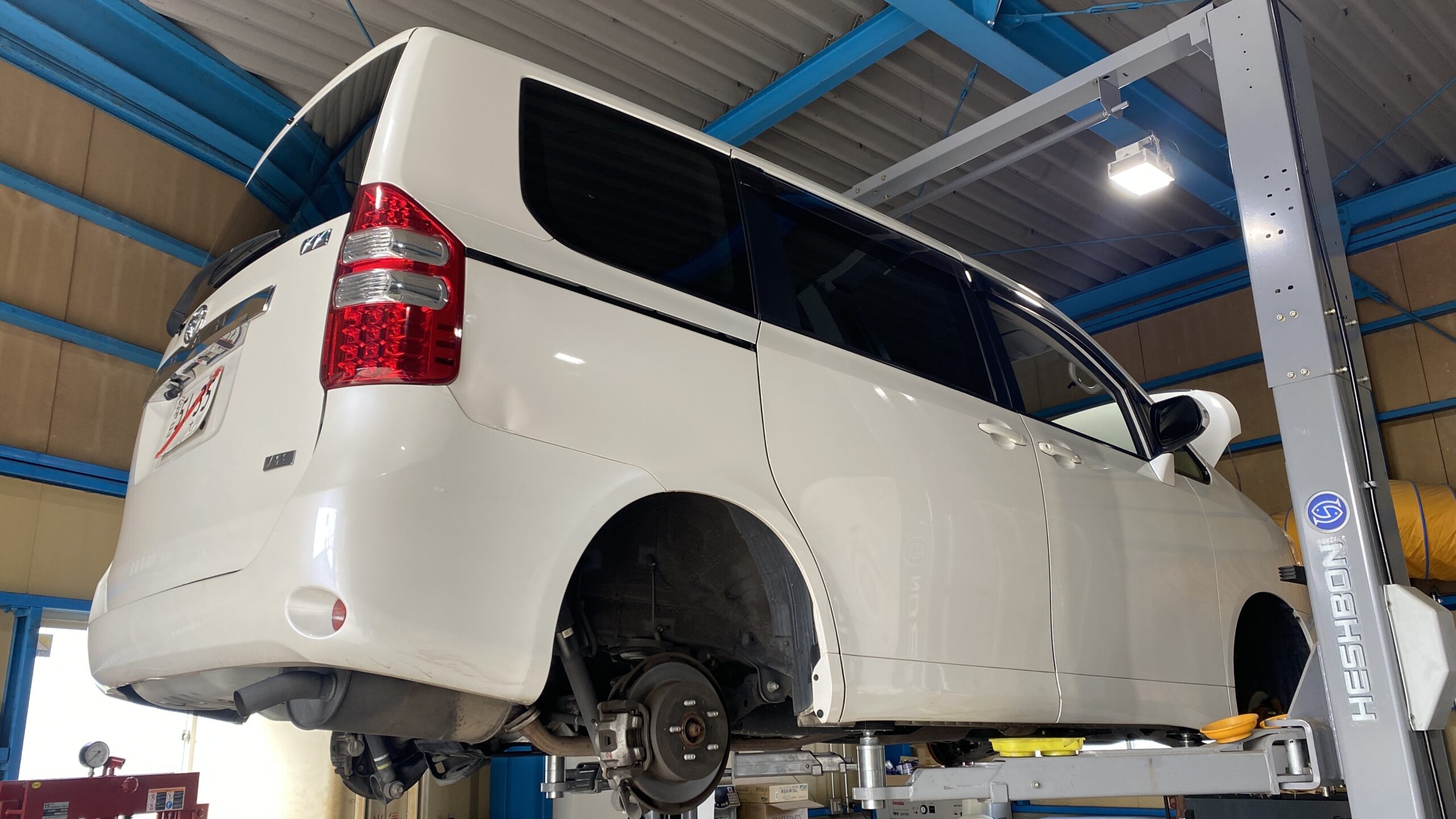 ブレーキ廻りの確認→下廻りの確認→エンジンオイル交換→ローテーションしたタイヤを取り付けてリフトから降ろす。